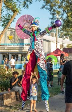 The Adventures of The Flying Umbrella Ship is a high-energy roving Circus spectacle that includes Stilt Walkers, The Flying Umbrella Ship, and Amplified Sound playing an energizing mix of world music.
